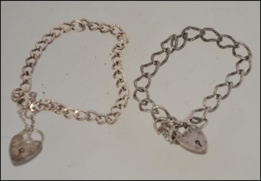 A pair of silver hallmarked silver curb bracelets both with heart lockets, one with assay mark for London and the other for Sheffield. 16.8g gross