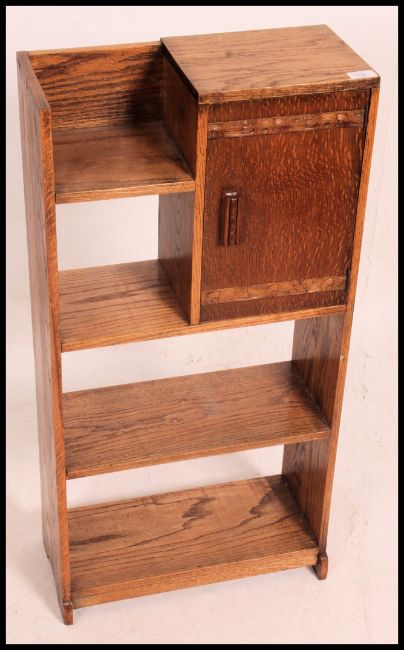 A 1930's oak open window bookcase cabinet having sectional bookcase shelves etc with fall front locker cabinet atop. 92cm high x 46cm wide x 21cm deep