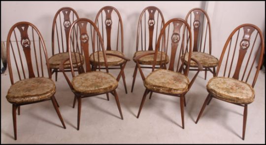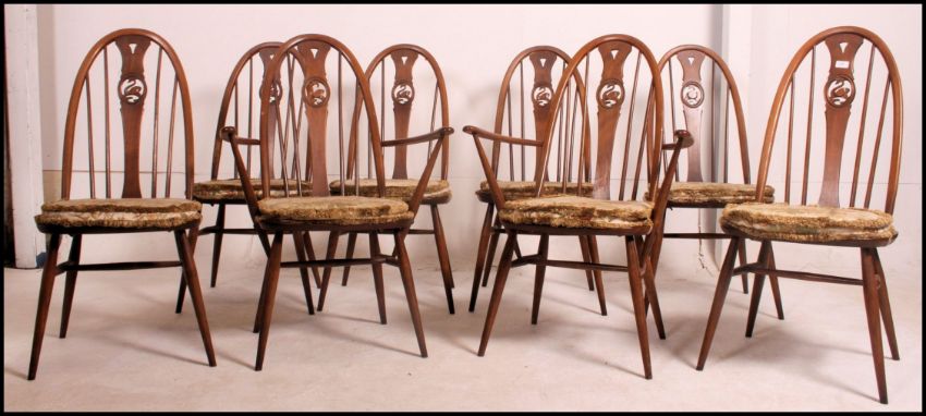 A set of eight Ercol elm seat and beech wheelback chairs, each chair having an Ercol button to the underside, matching table in lot 1105. 99cm high x 66cm wide x 30cm deep.