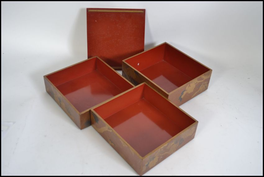 A Japanese laquered 3 tier foot box - maki-e jubako. The gilded detailing being well laquered with leaves and foliates etc H23cm