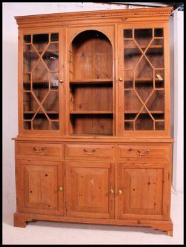 A 20th century pine Regency revival library bookcase cabinet. The base with drawers and cupboards having astragal glazed bookcase above. 201cm high x 145cm wide x 38cm deep