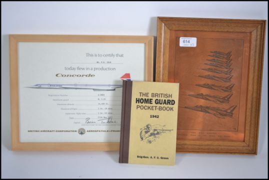A framed and glazed Concorde certificate dated to 1977 awarded to FE Cole together with a 1976 copper plaque of the Red Arrows and a modern book on the Home Guard