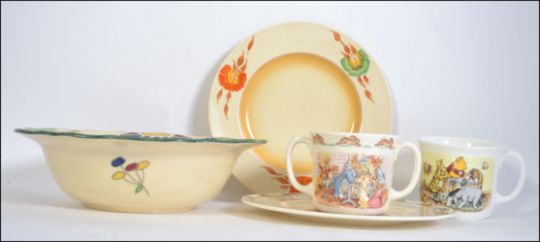 Clarice Cliff art deco small sandwich plate with orange and green floral decoration , Royal Doulton serving bowl Doulton deco: unnamed earthenware, D5235, c1933 (pattern, impressed 11-33). Vibrant stylised fruit trees & triangular rain drops with dark green trim. Classic deco shaped edges , along with Royal Doulton Bunnykins Christening mug and plate plus a Doulton Winnie The Pooh mug Largest W25cm