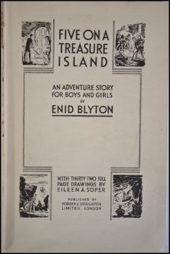 Enid Blyton; Five On A Treasure Island. Rare First Edition, First Printing. 1942 by Hodder & Stoughton. Lacking dust cover. Blue cloth boards with black titles.