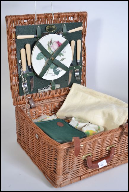 A collection of vintage linens and cloths all being contained within a vintage whicker picnic hamper