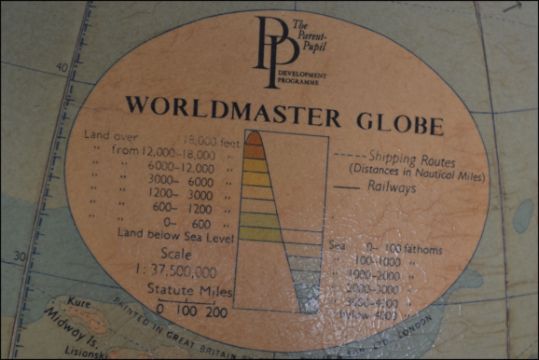 A retro desk globe. The parent Pupil Worldmaster Globe raised on a teak base. H48cm