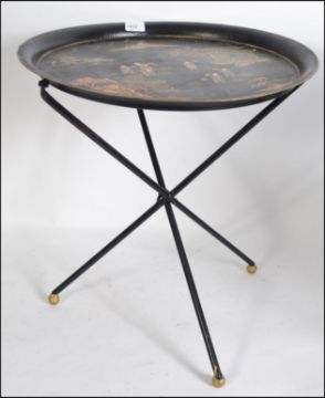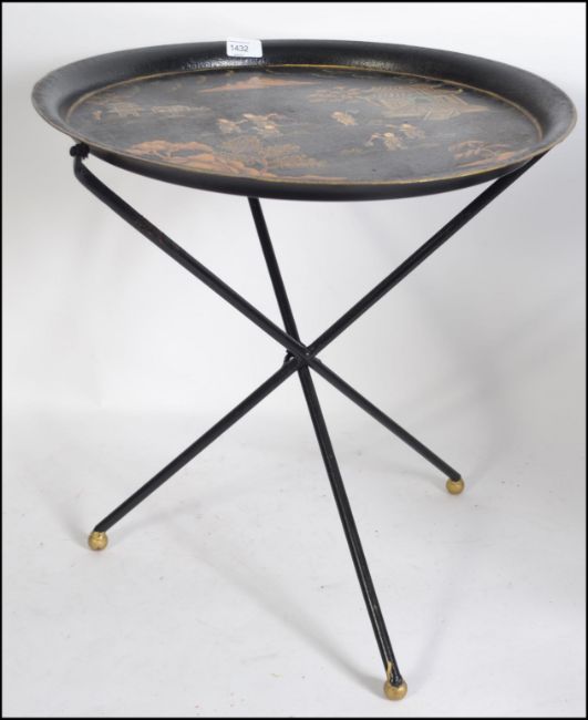 A 20th century retro atomic and oriental style metamorphic folding occasional table on tripod support, the tray in the oriental Japanese laquered style