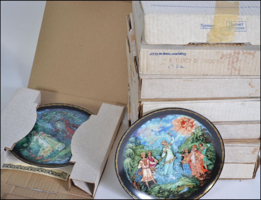 A collection of eight collectable Russian collectors plates each with a different colourful design all stamped to the back
