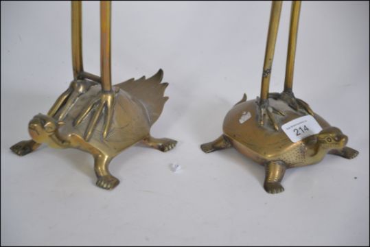 A pair of 20th Century Oriental brass candle holders in the form of Tsuru and Kames (cranes and turtles) H58cm
