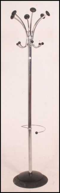 A chrome atomic style retro full height vintage coat and umbrella stand with black trim and umbrella drip tray 174cm high.