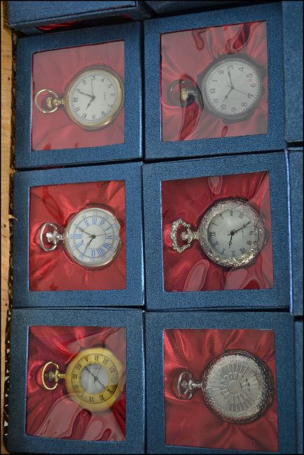 A large collection of unused still in original packaging pocket watches, all watches are of different designs, quartz movement and unused