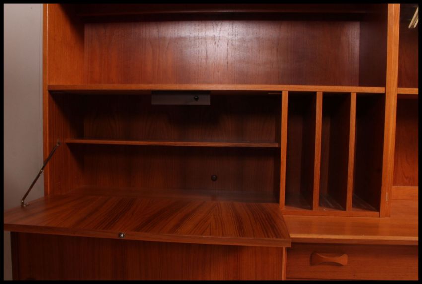 A retro 1970's Clausen and Sons teak upright double sideboard display cabinet having cupboards to the base with upright body having glass cabinet and shelves. Splits into three pieces for ease