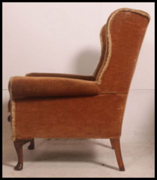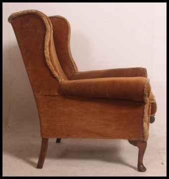 A vintage mid century Parker Knoll wing back armchair raised on Queen Anne cabriole legs finished in a rich yellow velour fabric with trim