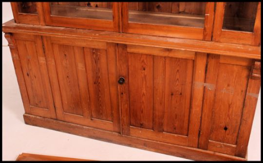 A good 20th century pine dresser with upper section enclosed by two glazed doors having adjustable shelves above two cupboard doors. Measures: 239cm high x 184cm wide x 56cm deep