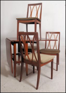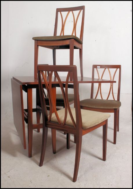 A set of four 1970's G-Plan teak lattice back retro dining chairs raised on tapered legs with overstuffed padded seats along with a G Plan drop leaf teak wood table . 73cm high x 81cm wide x 42cm deep.