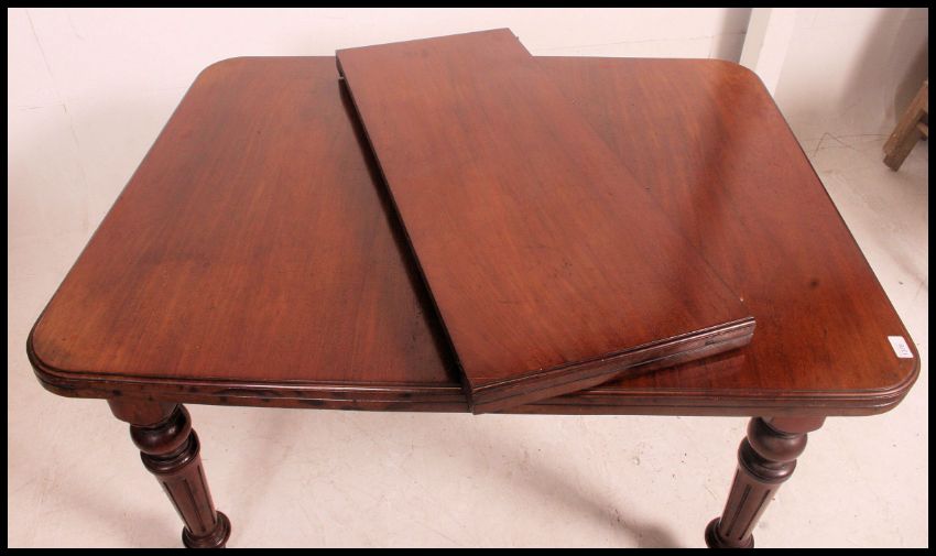 A 19th century mahogany wind out dining table of good quality having an extra leaf. The table being raised on reeded turned legs with ceramic castors. Measures: 75cm high x 120cm wide x 95cm deep