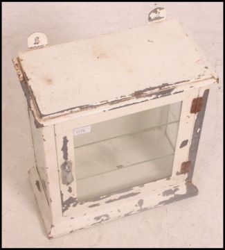 A good vintage glass advertising / shop display countertop cabinet, white painted, with glazed front and glass shelves within. 50cm high x 41cm wide x 22cm deep.