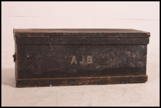 A vintage early 20th century ebonised pine tool box, having a hinged lid opening opening to reveal a removable storage tray, with gilt lettering ATB to the front 36cm high x 93cm wide x 36cm deep.