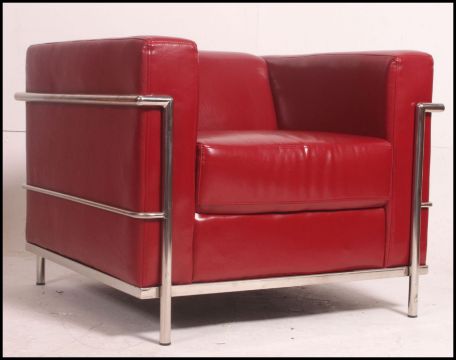 After Le Corbusier. An ' LC2 ' type red leather and chrome armchair. The polished chrome tubular frame with red leather seat of angular form. 69cm high, 89cm wide, 83cm deep