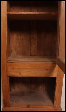 An early 20th century unusual pine shop cabinet display unit ( haberdashery ) having full length door with unusual glass panel side. 188cm high x 67cm wide x 35cm deep