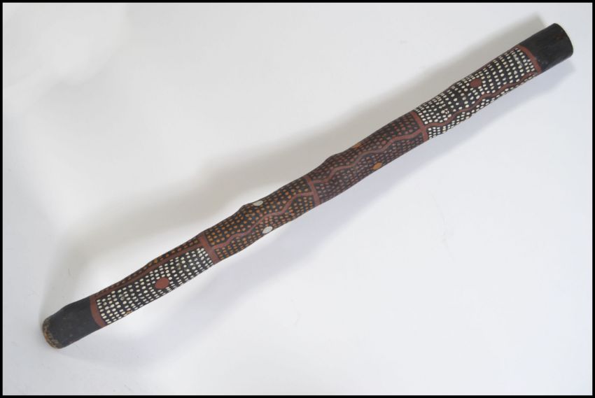 A traditional mid 20th century Aboriginal / Australian didgeridoo with painted animal and geometric decoration