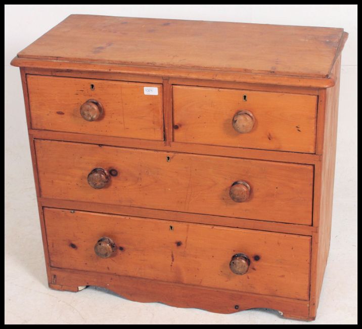 A Victorian pine chest of two short over two long drawers with knob handles on plinth base flared top above. Measures: 76cm high x 89cm wide x 43cm deep