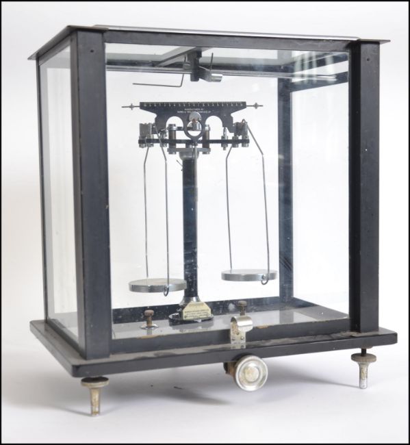 A good set of mid century ex Imperial Tobacco black glass cased scientific scales by Baird & Tatlock H39xW37xD24cm
