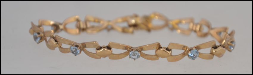 A 9ct gold ( stamped 375 ) braclet 19cm being linked together with 9 bow shaped links and each bow having an aquamarine stone approx 15 points please see images. 8.4g gross