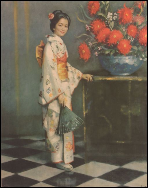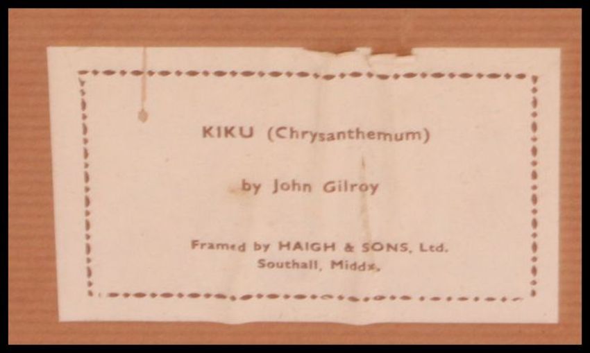 A retro framed print ' Kiku ' ( Chrysanthemum ) from the 60s or 70s after a painting by John Gilroy (1898-1985), equally well known now for his Guinness and P&O poster illustrations.Depicting an Oriental lady wearing a kimono standing beside an large arrangements of red Chrysanthemum flowers. 59cm high x 47cm wide.