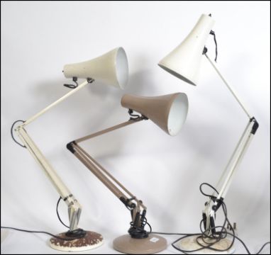 A collection of three Herbert Terry anglepoise desk lamps raised on circular bases, two in white and the other in brown