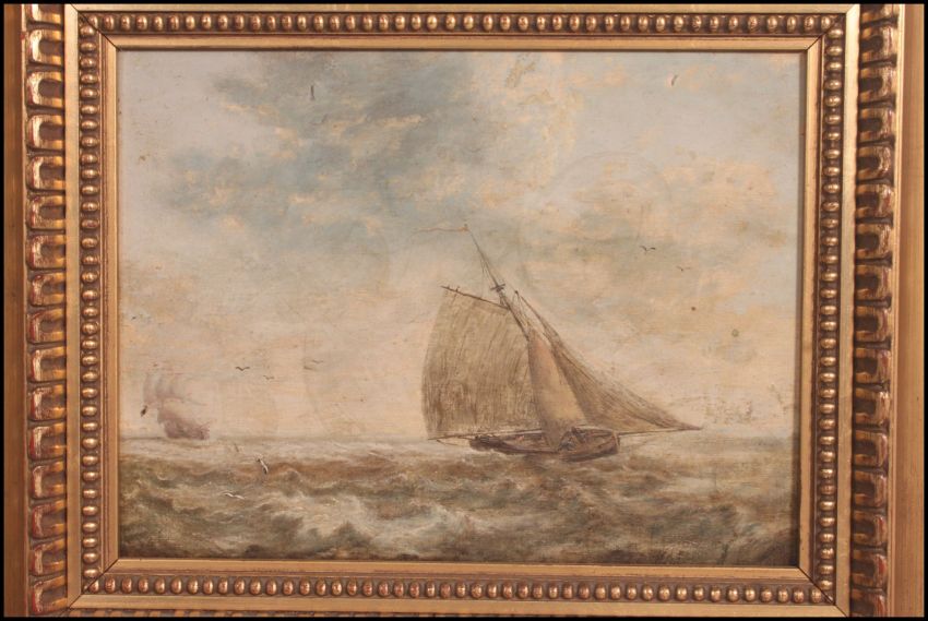 Jan Van De Cappelle (1626-1679) Netherlands. 1650. An oil on panel painting of a schooner at sail with tall ship to the background. The oak chamfered panel set within a gilt frame having paper notation and dealer sticker for Fraser & Son Fine Art Dealers, Dundee Scotland. Measures 19.5cms high x26cms wide