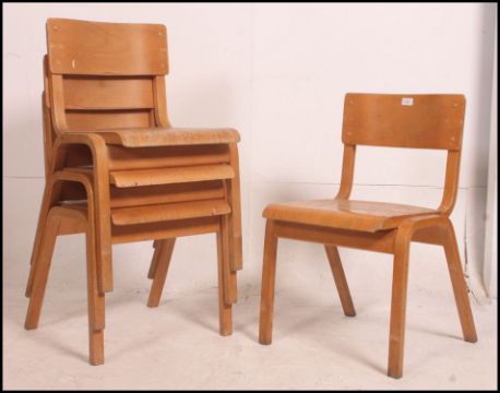 A set of 4 vintage ply panel bentwood school - stacking hall chairs raised on bentwood angular legs 75cm high x 48cm wide x 54cm deep.