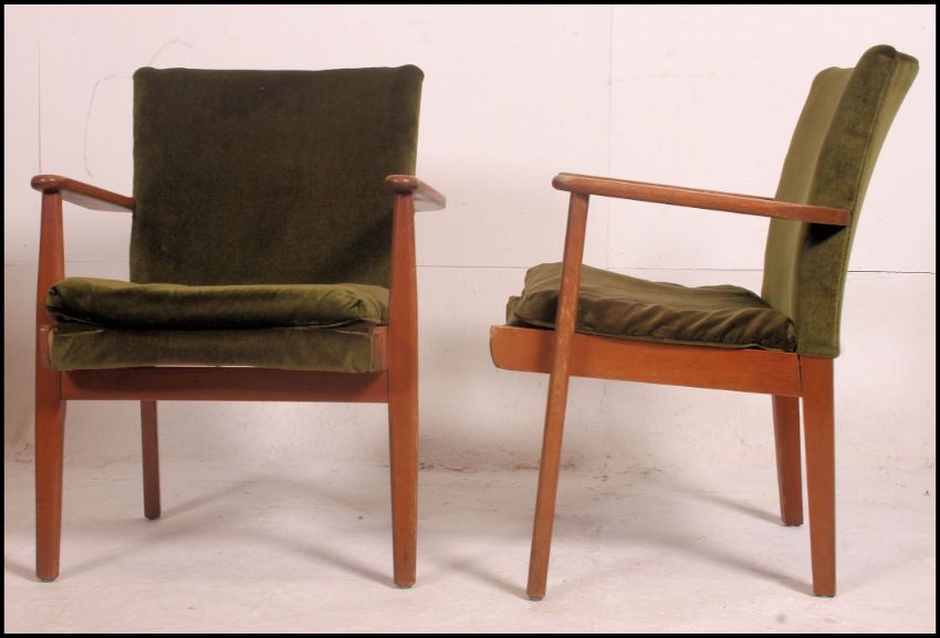 A pair of 1950's retro vintage Parker Knoll armchairs raised on angular show wood frames being stamped to the underside having green velour upholstered seats. Measures: 80cms high x 61cms wide x 61cms deep.