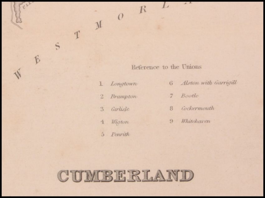 A framed and glazed 19th / 20th century coloured lithograph map of Cumberland by R Creighton
