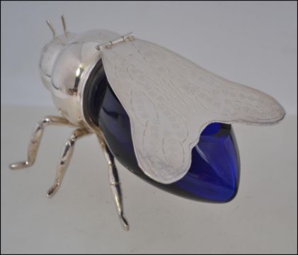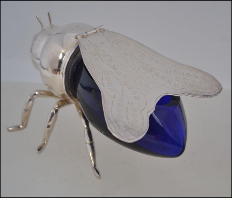 A silver plated and blue glass novelty honey pot in the form of a bee in the Mappin and Webb style L15cm
