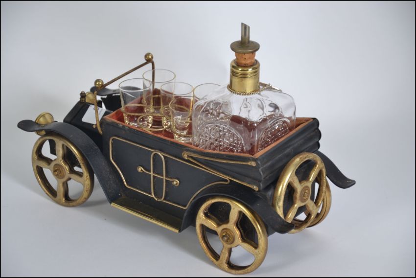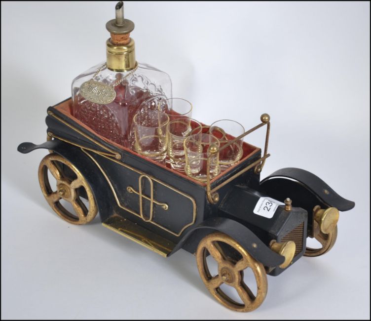 A vintage novelty musical decanter and glass set in the form of a motor car L35cm