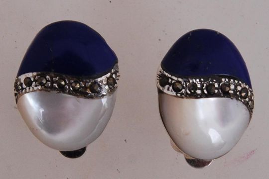 A pair of 925 silver clip-on earrings set with lapis lazuli and marcasite. Marked 925.
