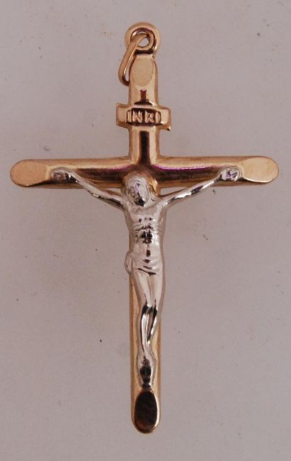 A 9ct gold pendant cross crucifix inscribed INRI. Measures 5cms. Hallmarked Birmingham.