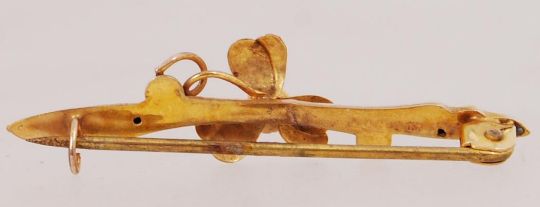 A 9ct gold bar brooch with 3 leaf clover motif set with central red stone with C clasp. Marked AJH 9ct. Measures 3.8cms.