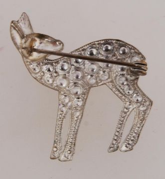 A vintage 1950s Charles Horner figural brooch pin in the form of a deer fawn with green rhinestone eye and black enamelled hoofs with c clasp.