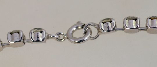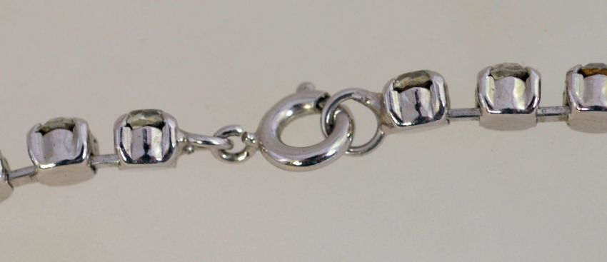 A 1950s rhinestone necklace in a silver tone metal setting with a bolt ring clasp, measuring 39.5cms long.