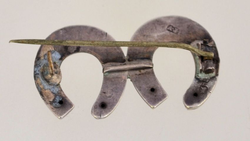 A Victorian silver double horse-shoe brooch with a loop catch, marked "London 1870" and measuring 3.4cms long.