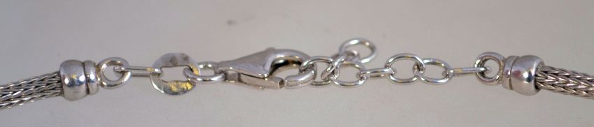 A silver mesh rope necklace with decorative rings and portugese hallmarks and a "925" marking. It measures 45cms long.