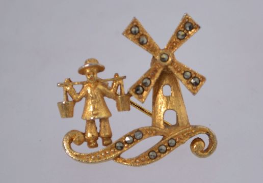 A vintage marcasite brooch in a gold tone setting, with a rollover clasp. Measuring 3cms long.