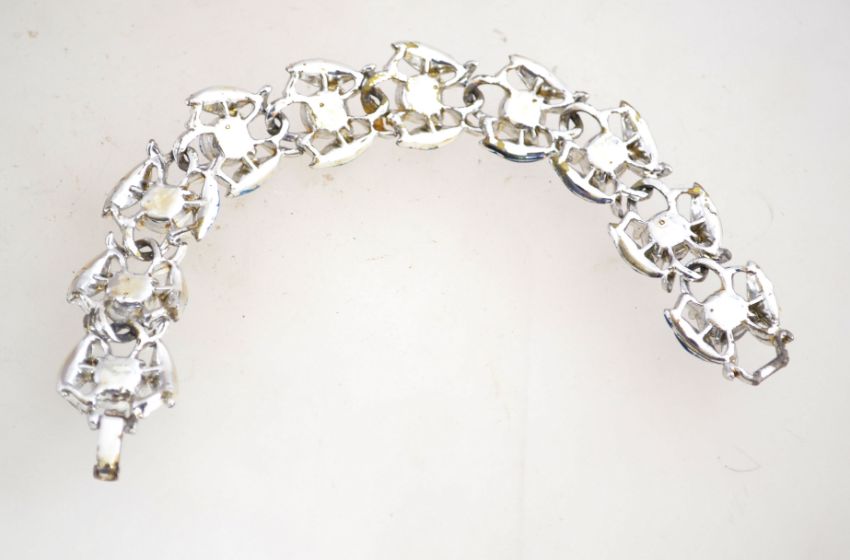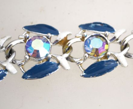 A1950s rhinestone and enamel bracelet in a silver tone metal setting with a fold over clasp, measuring at 18cms long.