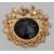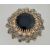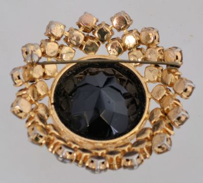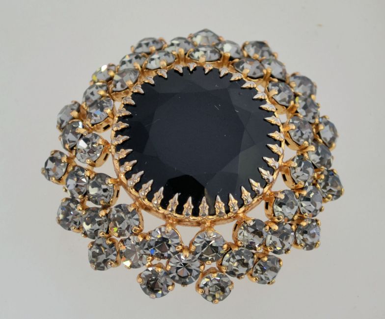 A Carque 1960s cluster brooch with grey rhinestones surrounding a large black stone, all in a gold tone setting. It measures 7cms across.