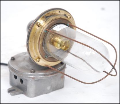An Industrial cast metal heavy set bulkhead / dairy lamp with caged pendant style bulb on polished steel wall mount being re-wired and ready to use