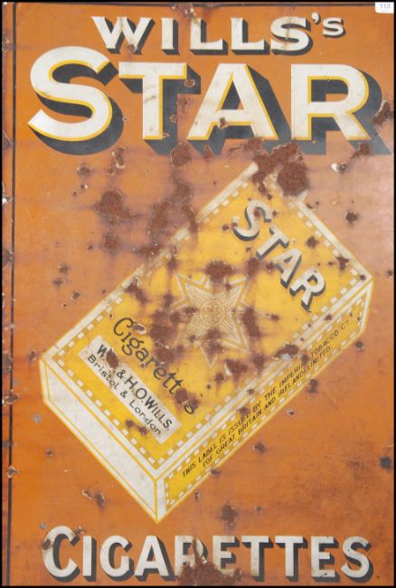 A vintage early 20th century Industrial enamel advertising sign for Wills Star Cigarettes. Of rectangular form with good remains of colour though some less. 92cms x 61cms