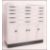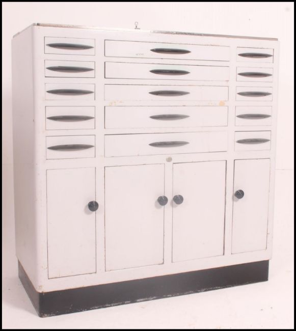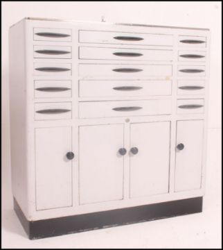 A 1950's mid century dentists cabinet having sectional metal body comprising a series of drawers and cabinets having black glass top above. 110cm high x 105cm wide x 51 cm deep