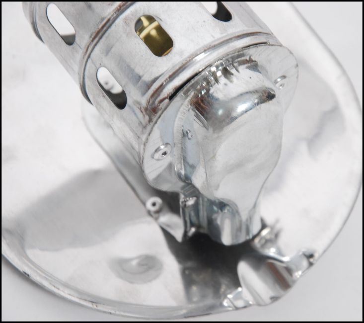 A pair of Industrial polished aluminium minimalist wall lights having lozenge back plates with pierced cylinder bulb brackets. 28cm high x 16cm wide